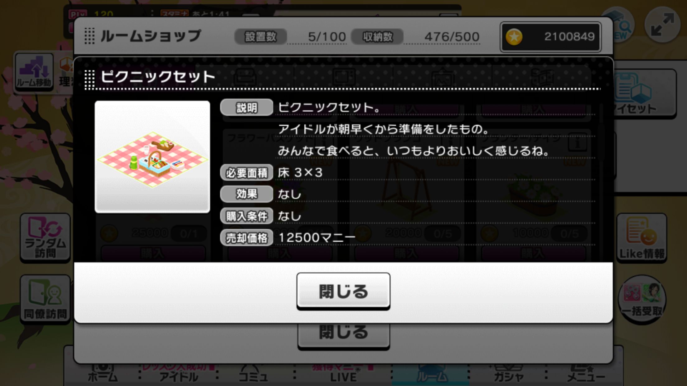 ピクニックセットだけど、アクション発生中にその近くにあるルームアイテムを移動させると、右側に座ってるアイドルがピクニックセットから離脱して、残された1人が透明なアイドル相手にアクションを続けるバグが見つかった。