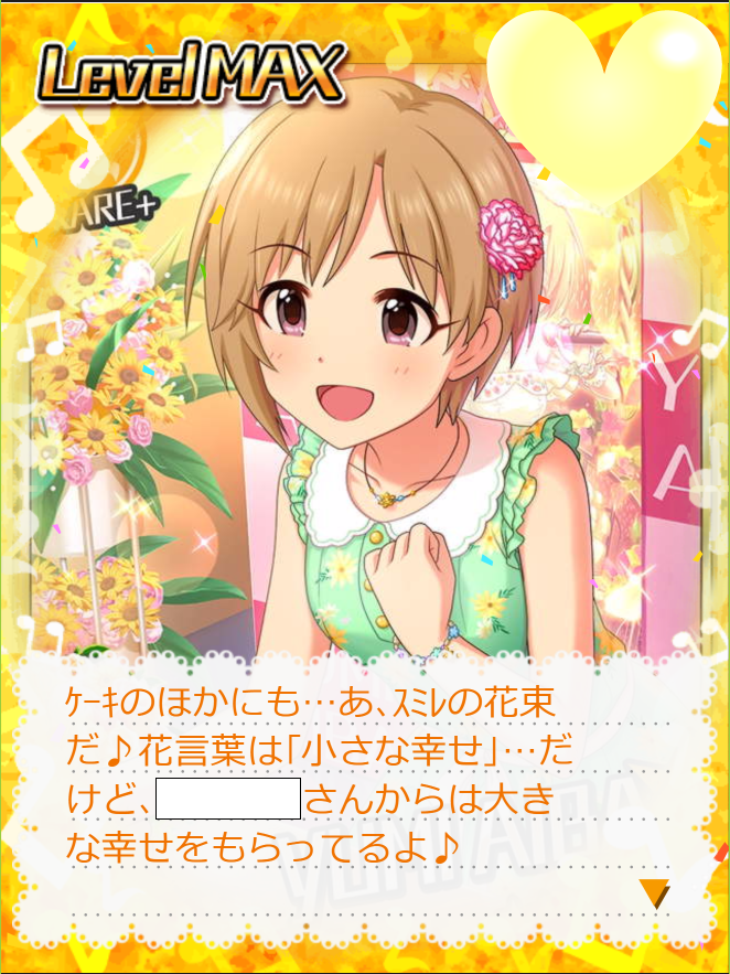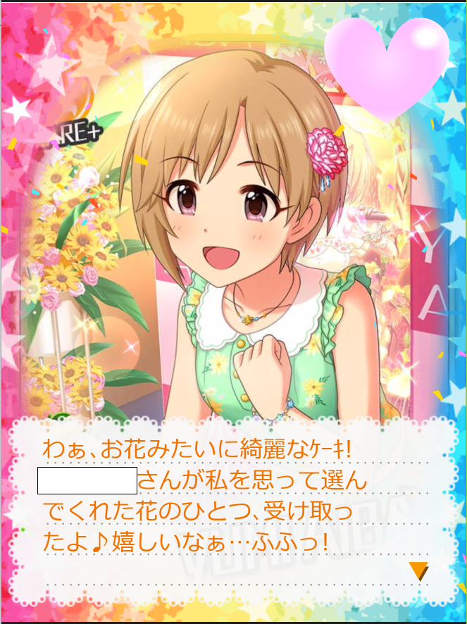 《ケーキのほかにも…あ、スミレの花束だ♪花言葉は「小さな幸せ」…だけど、プロデューサーさんからは大きな幸せをもらってるよ♪》