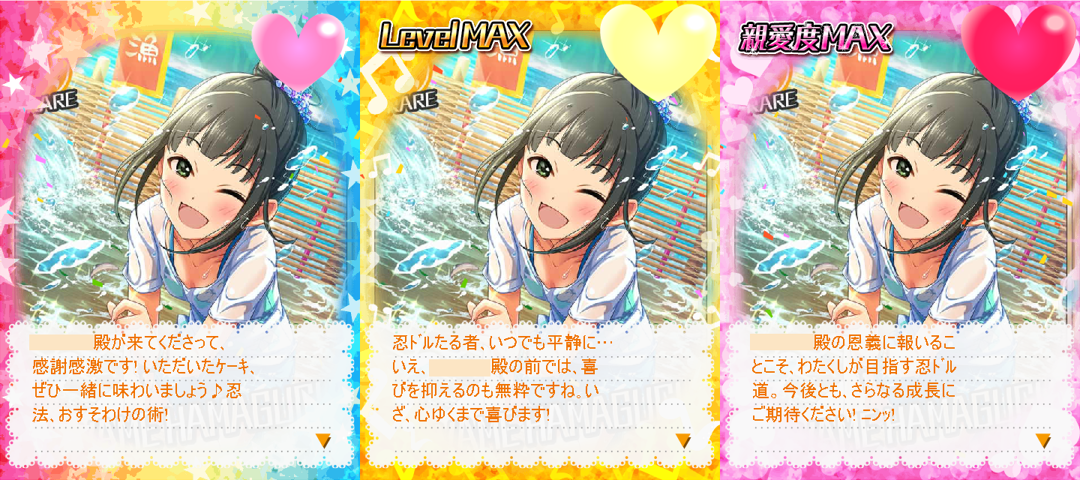 「プロデューサー殿の恩義に報いることこそ、わたくしが目指す忍ドル道。今後とも、さらなる成長にご期待ください!ニンッ!」