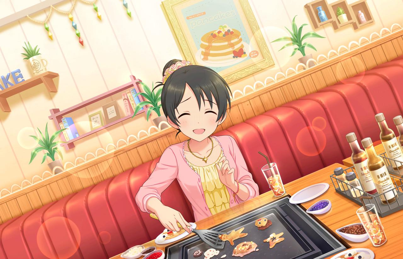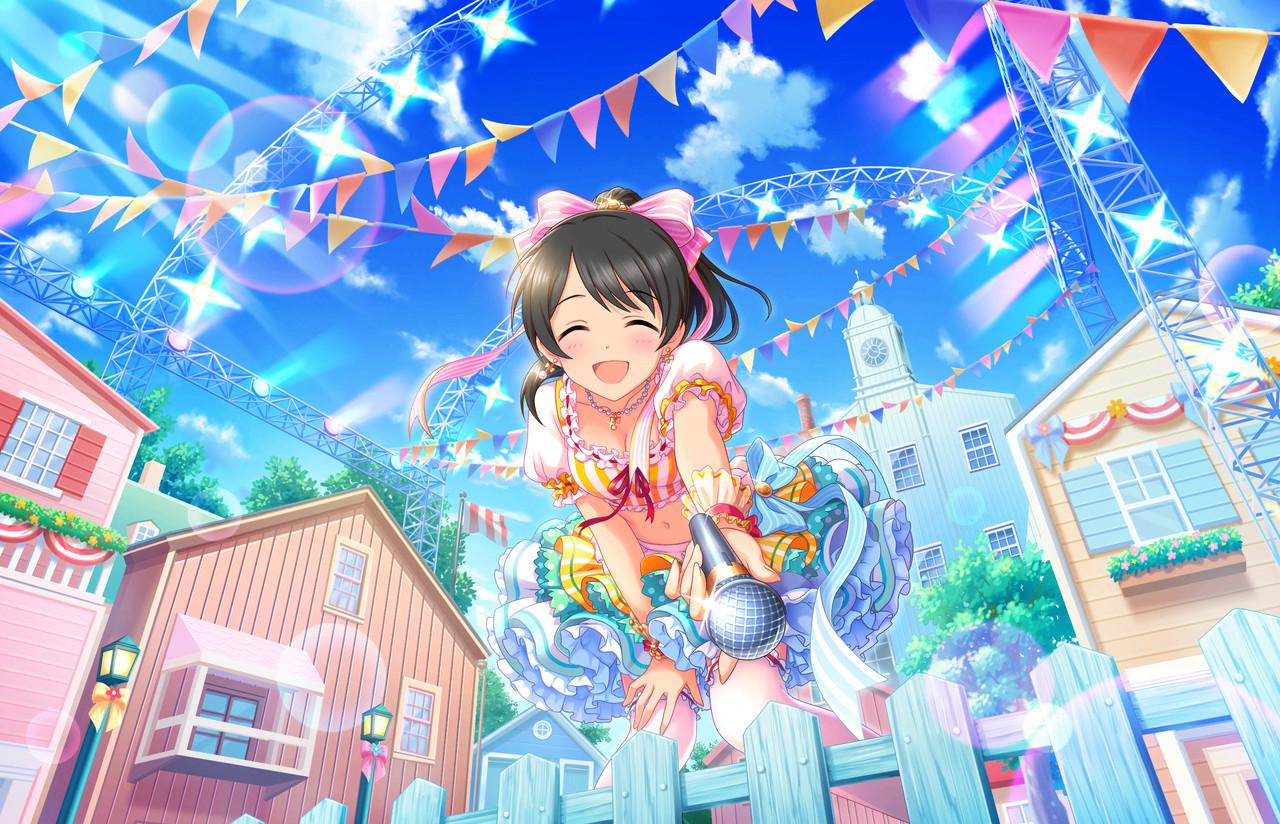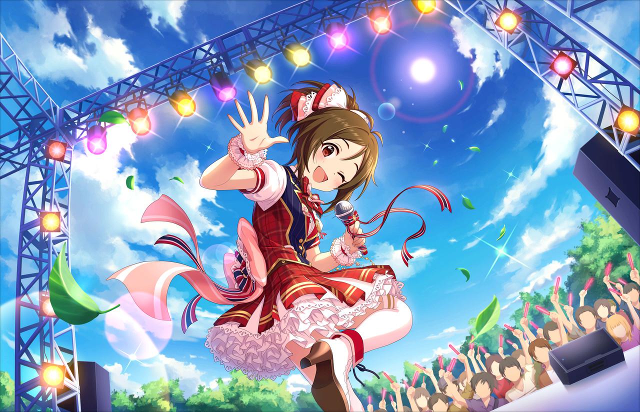 特訓後の衣装がなんだか懐かしい感じがするが、モチーフになっている衣装が見当たらず。ファンが奥、手前にカメラ、振り向き手を振る。新しい構図。これは野外フェスか。