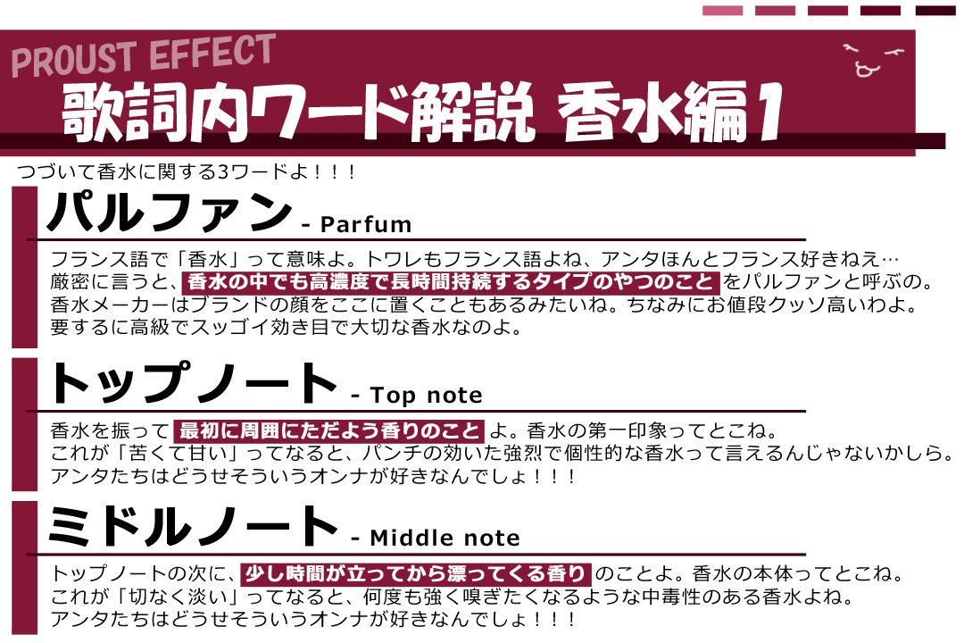 プルースト効果あるある。音とか匂いで過去の精神年齢になることあるある。トップ、ミドル、ラストで歌詞の中に時系列あったのね。人のラストノートは切ない。