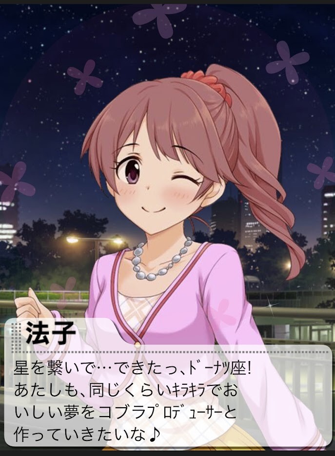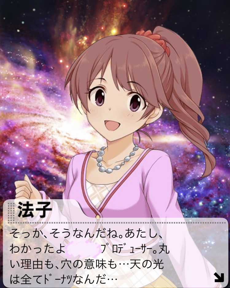「そっか、そうなんだよね。あたし、わかったよプロデューサー。丸い理由も、穴の意味も・・・天の光は全てドーナツなんだ・・・」