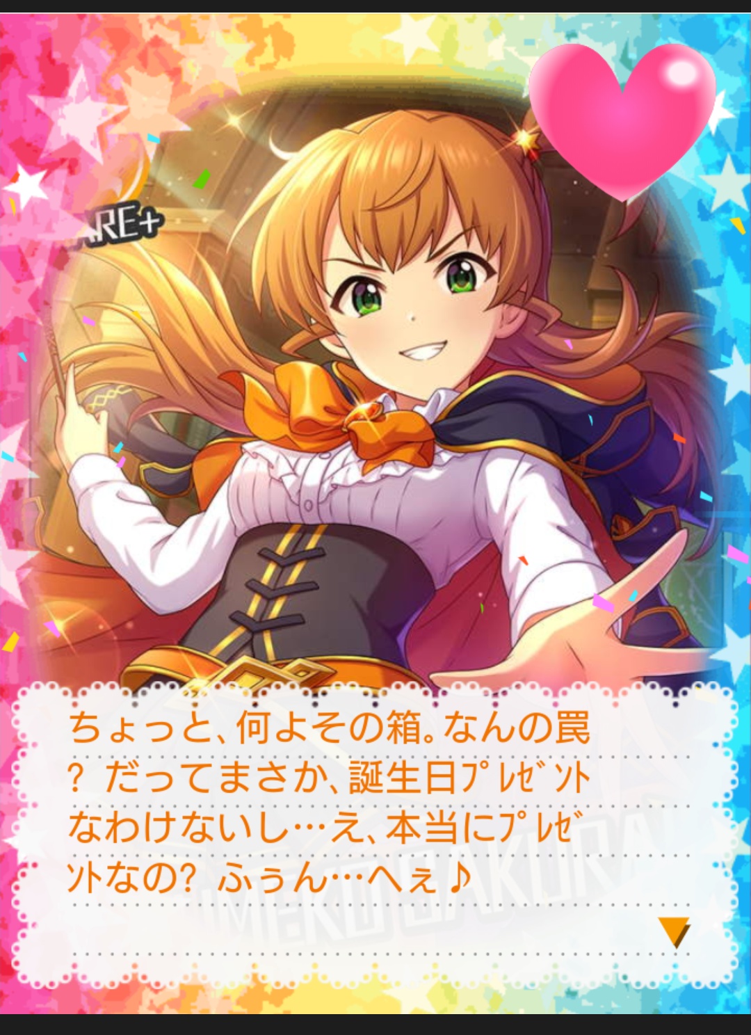 「何か用?まだレッスンが・・・プレゼント?私に貢ぎたくなる気持ちはわかるけど、理由もなしに・・・あ。ちょっと!誕生日じゃないの!」