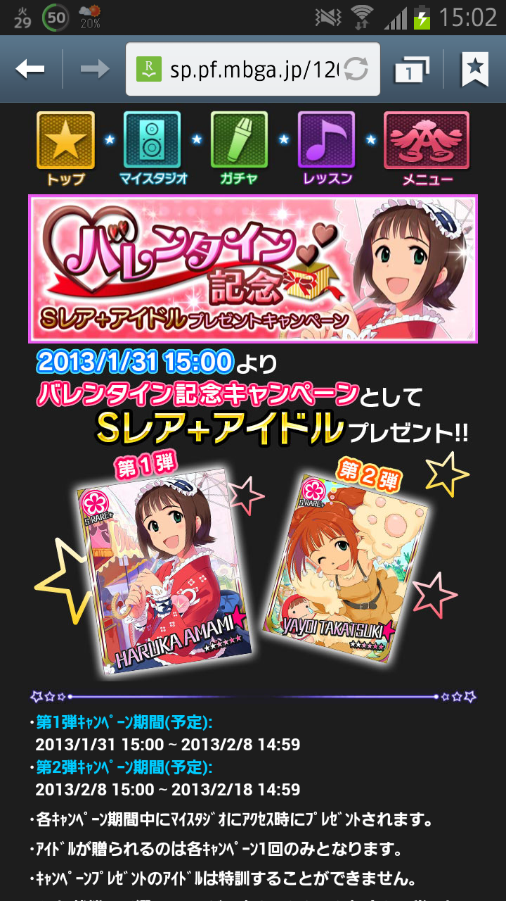 【速報】バレンタイン記念きた!1月31日にSR+天海春香、2月8日にSR+高槻やよいをプレゼント!ミニメールを贈ると引換券付きガチャチケも手に入るよ!