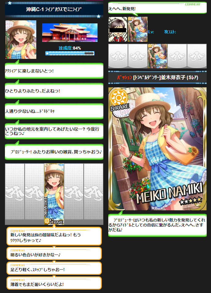 ああ、このパッションお姉さんというかアクティブお姉さんというか、可愛い。帽子が似合うって羨ましいな…めーこちゃんさぞかし顔が小さいんだろう。メダルSR枠はたくさんの人にみてもらえるのでマジで羨ましい。