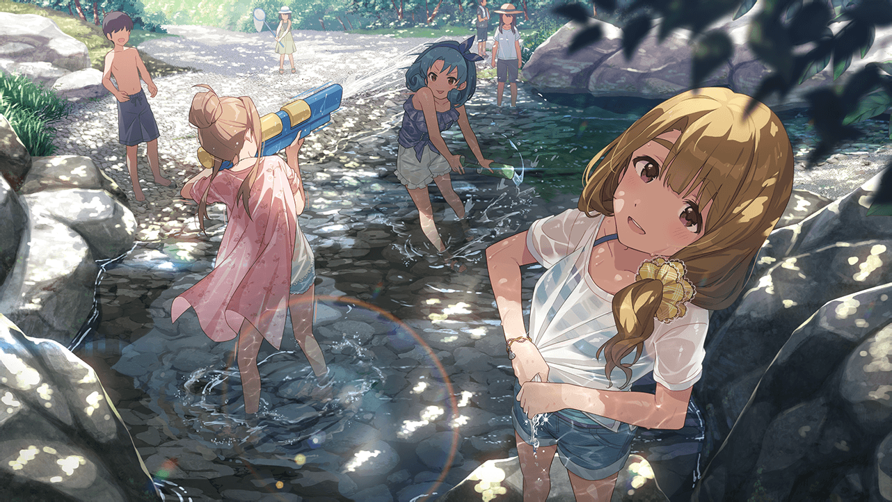 宮尾美也のカード絵柄の天空橋朋花様の至近距離の水鉄砲、完全にここで仕留める距離。服のすそをぎゅってしぼる仕草は最高だからミリシタ最高。