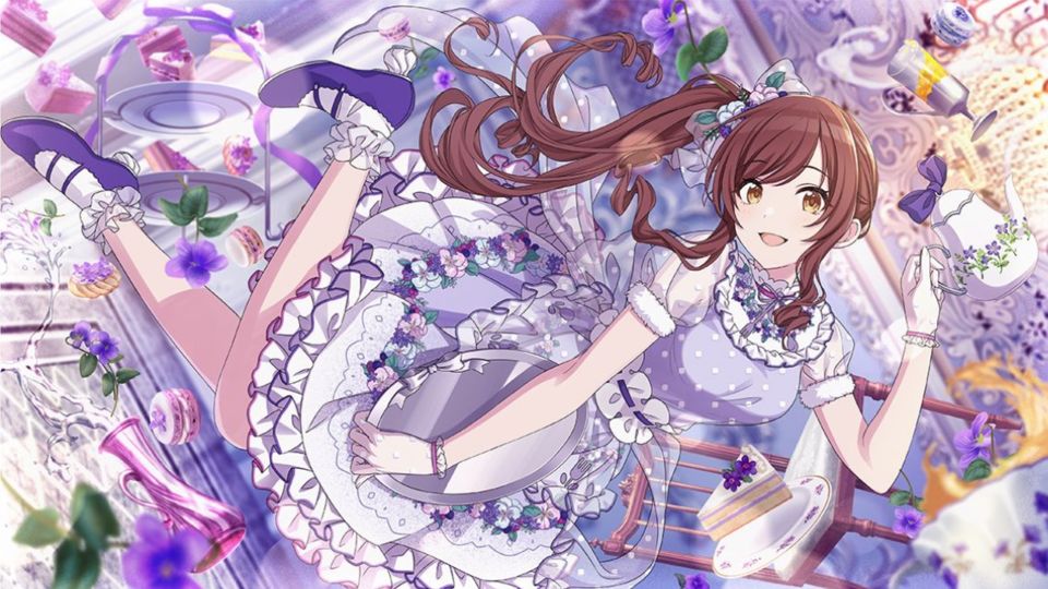 金魚SSR大崎甘奈。特訓後はぐるぐるまわってた。この食器たちがアルストロメリアの次のテーマかな?